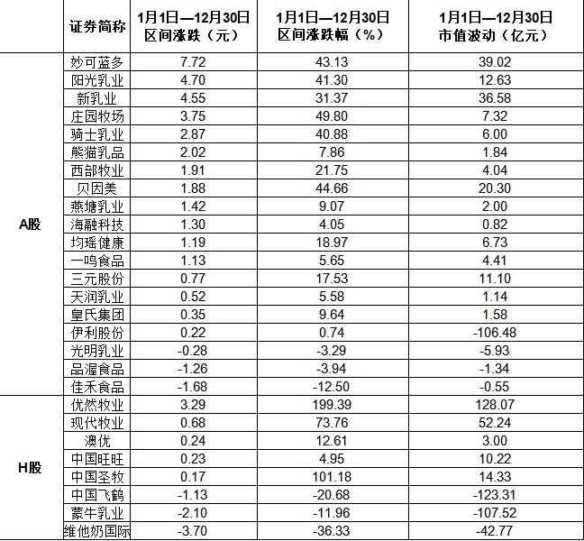 截至2025年12月30日,在可统计的27家A股及H股乳品上市公司中,超七成公司股价累计上涨,但整体涨幅较为有限。
